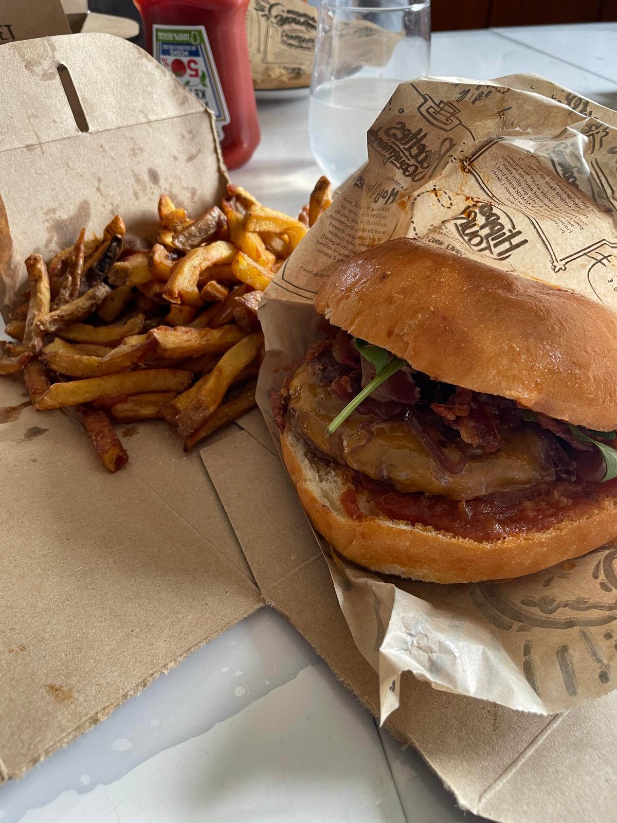 Viande bœuf,oignons confits,lard,frites maison