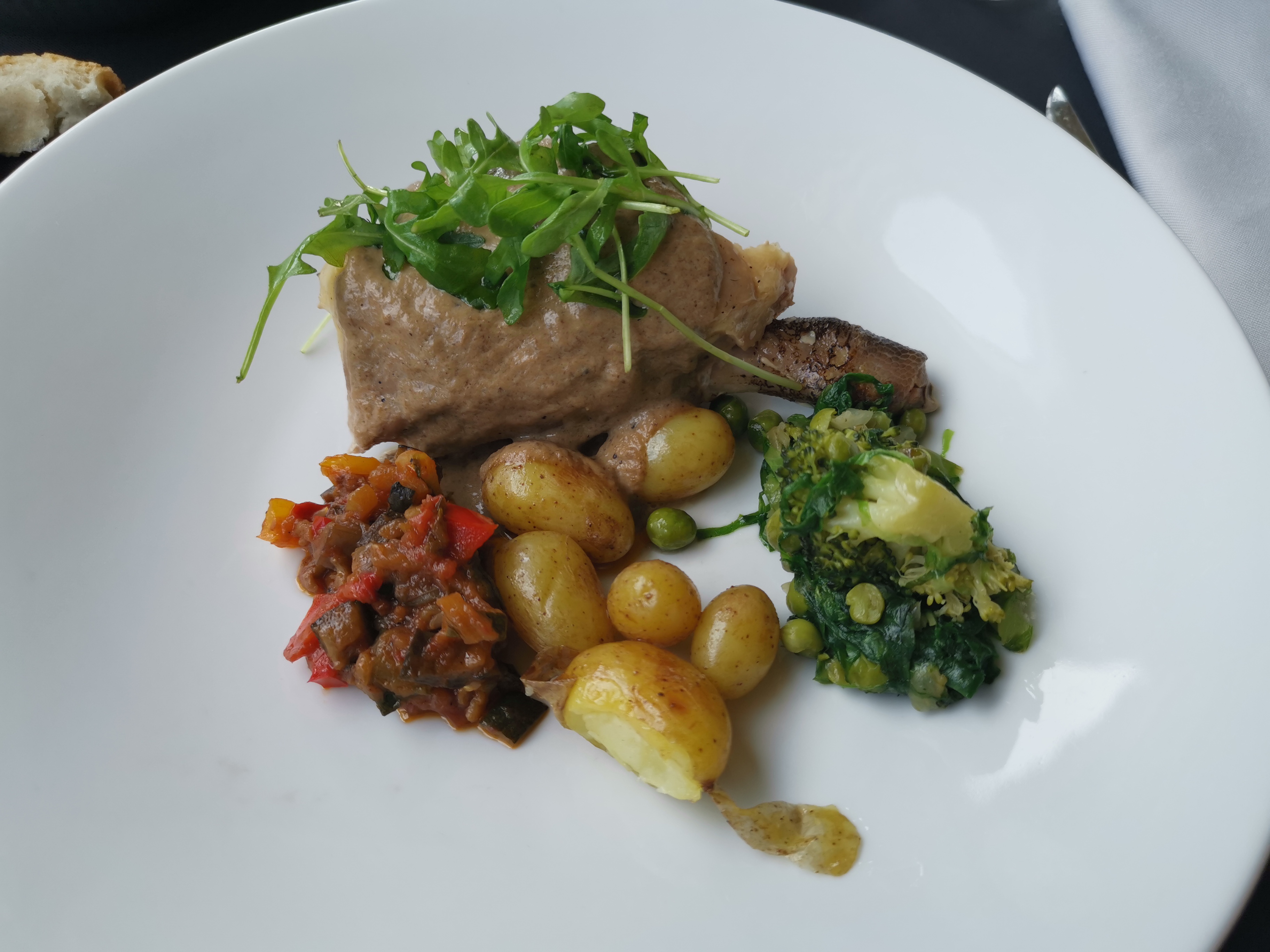 Cuisse de pintade fermière au lard, sauce aux morilles, ratatouille, rattes, petits légumes de saison (petits pois, chou, brocolis), roquette
