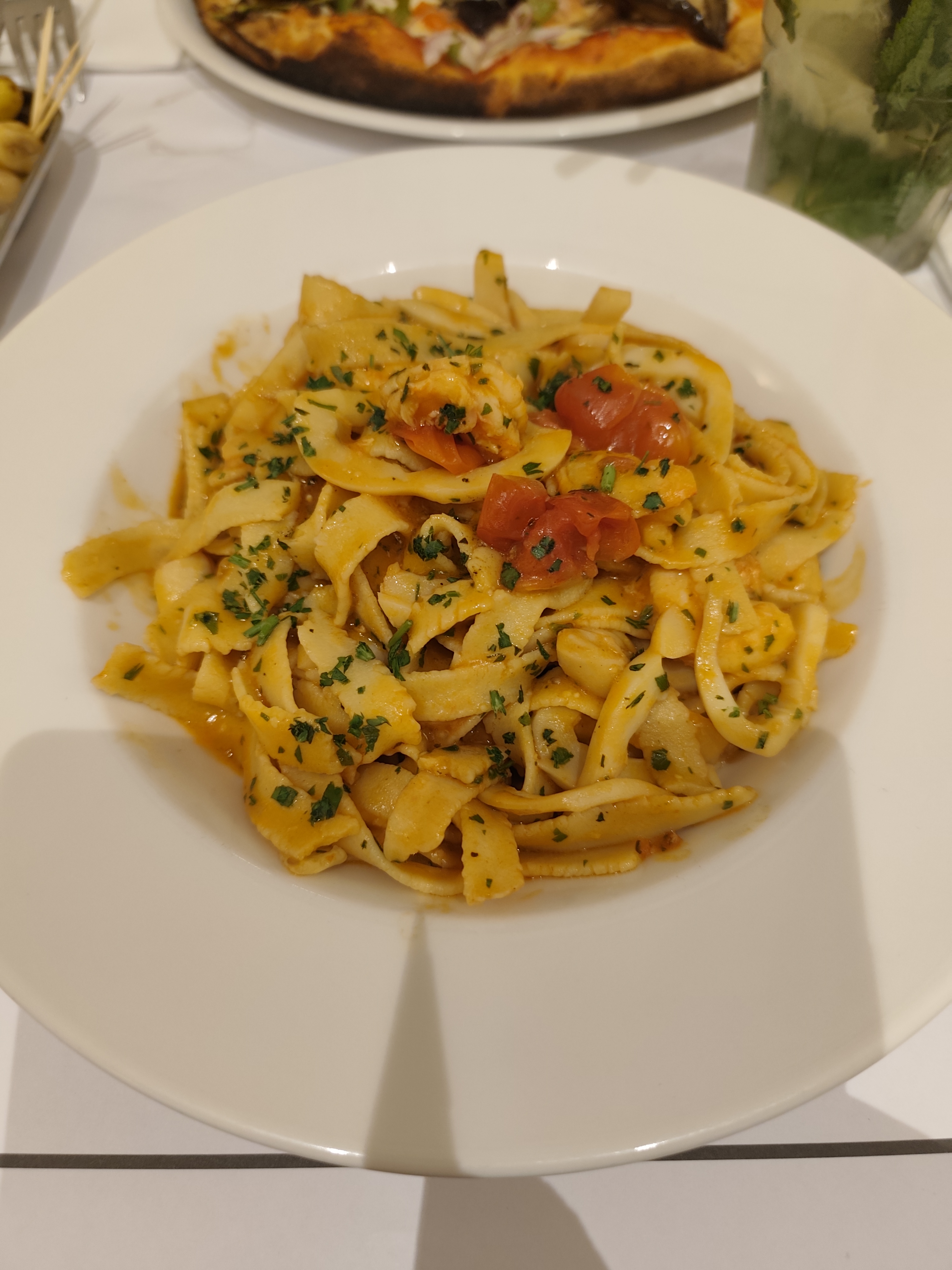 tagliatelles aux oeufs frais, sauce tomate, crevettes, calamars, parmesan