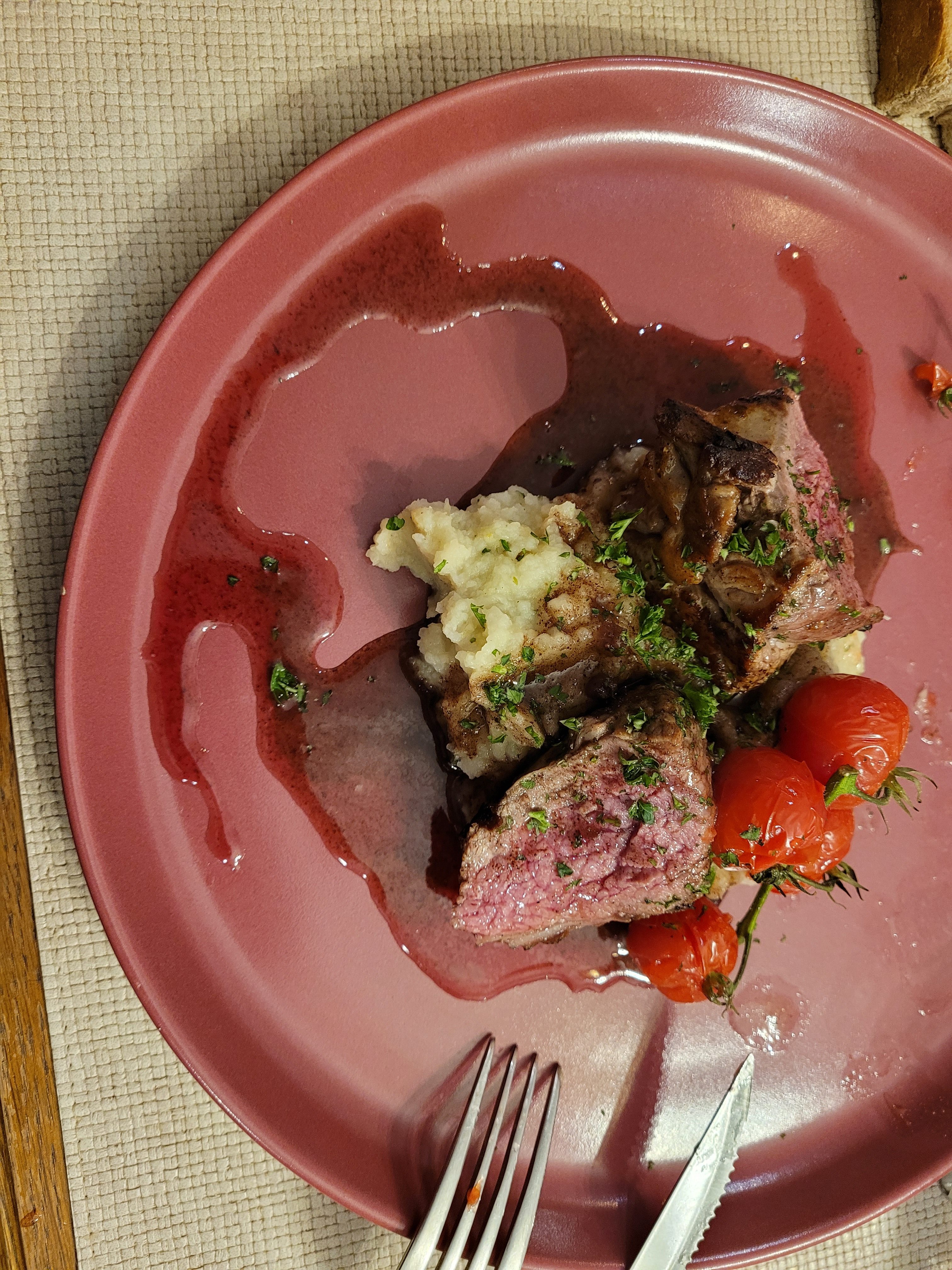 Gigot d'agneau rosé Jus à base de canelle (!) Purée celeri Fenouil Tomates cerises cuites