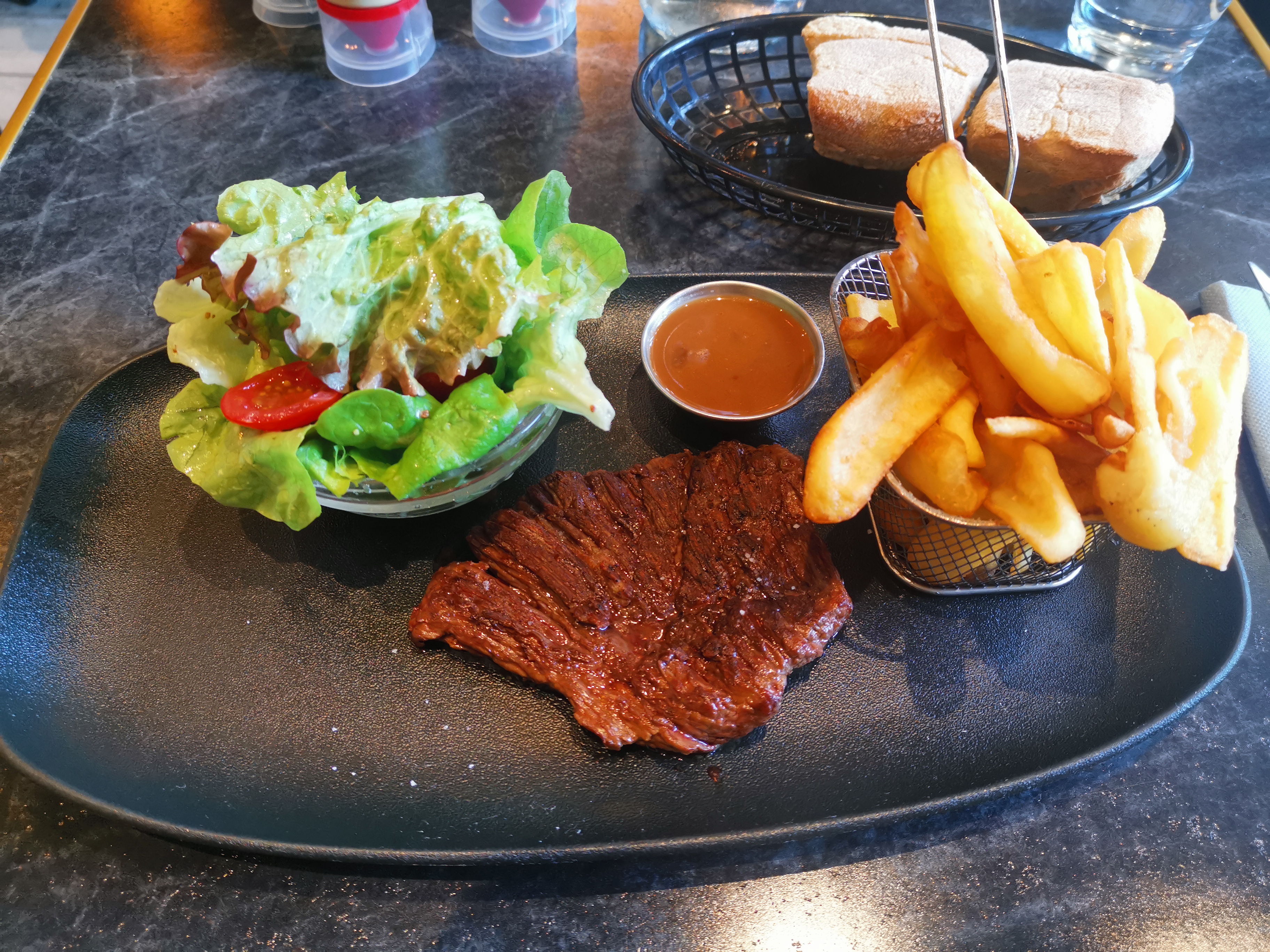 Bavette de bœuf, frites, salade, sauce au poivre