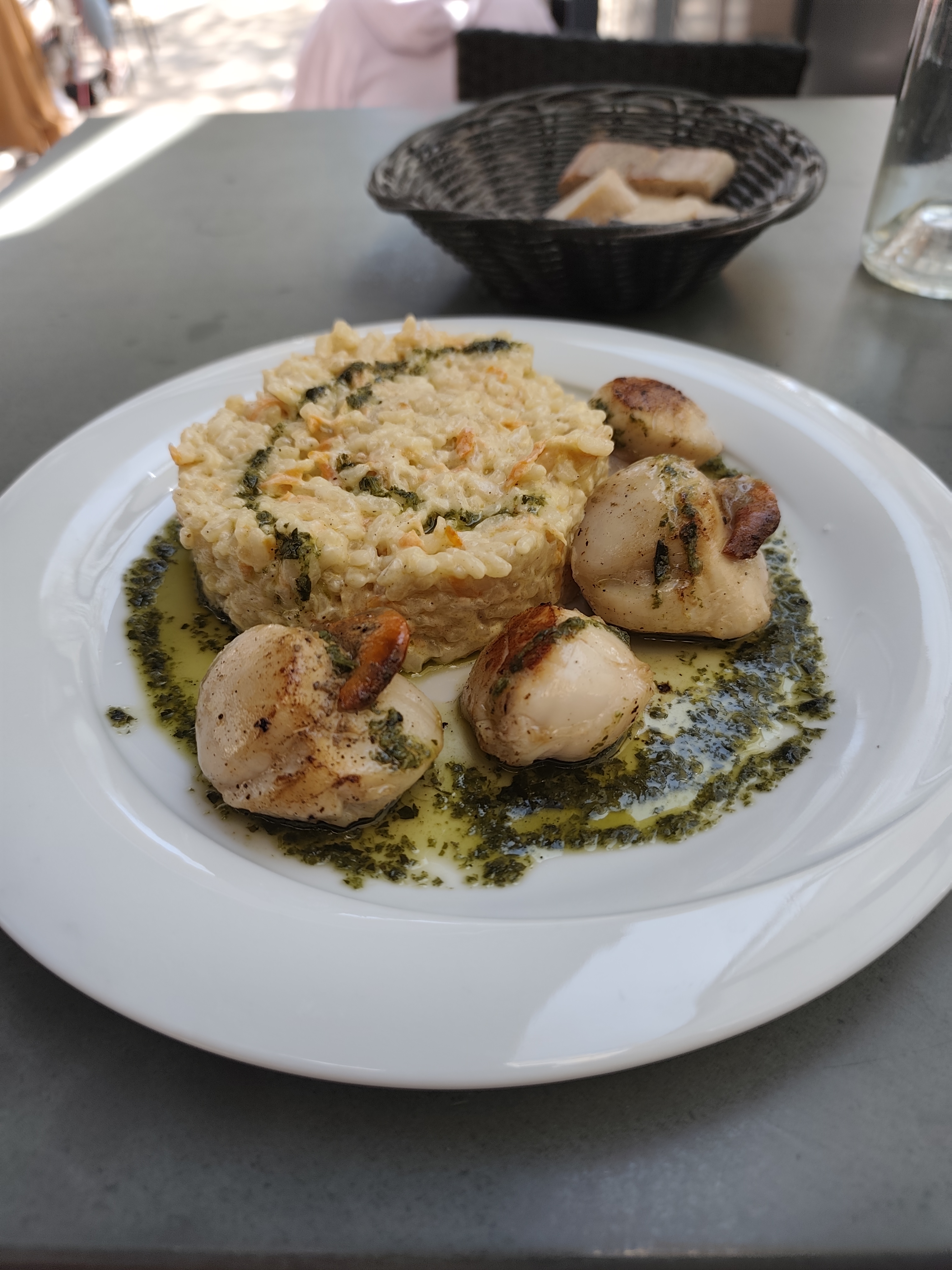 Risotto, noix de st jacques, légumes de saison, pesto maison