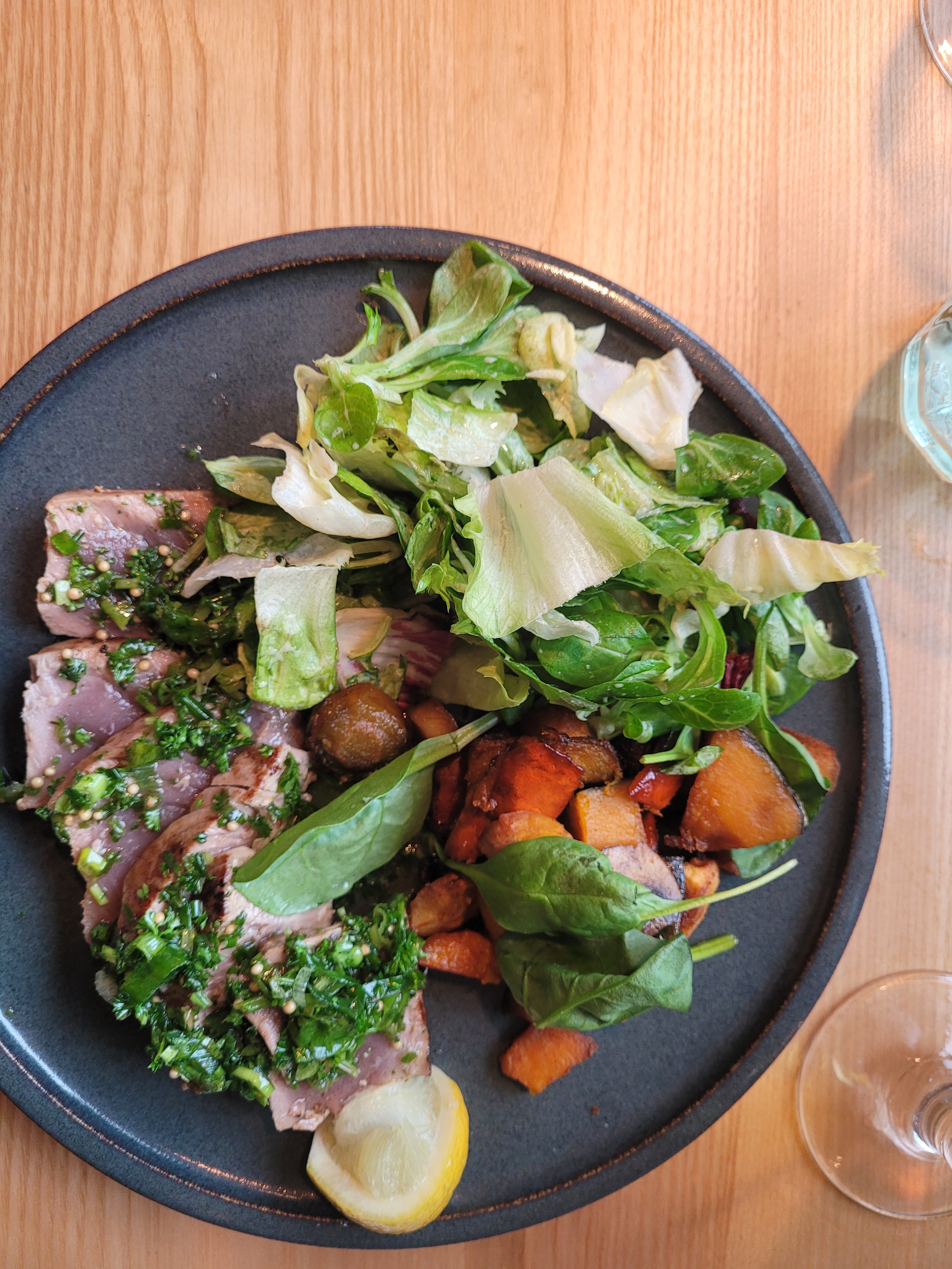 Tataki de thon Salade Potimarron et carottes rôties Champignons Sauce huile d'olive Herbes Tranche citron